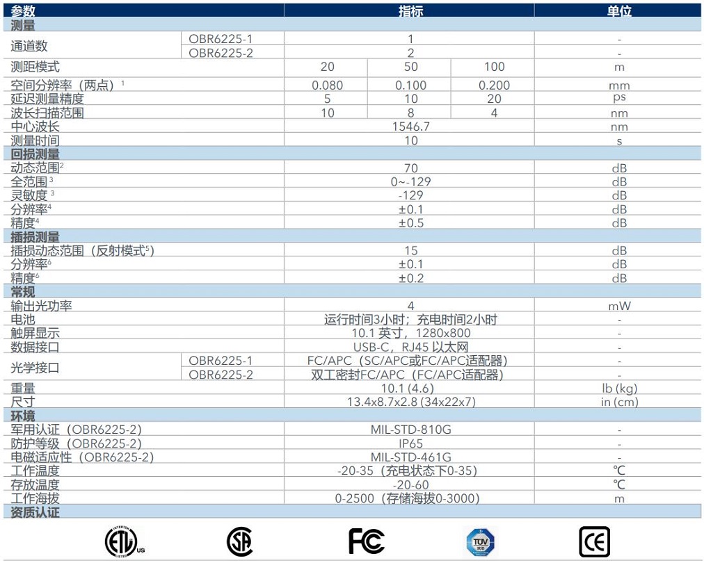 OBR 6225是航空航天、海军、运输和工业应用中短程光纤网络测试的理想选择。